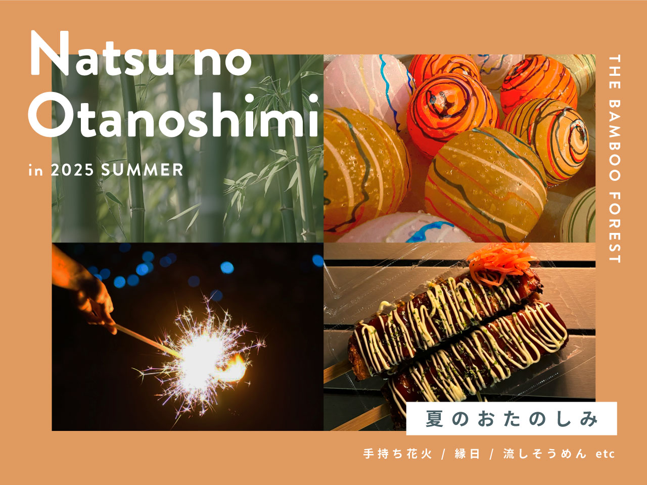 暑い夏のグランピングを楽しく快適に過ごせるよう、今年も夏支度をしてお待ちしております。エントランスのミストシャワーと粋な風鈴の音色がお出迎え。まずはつめたい瓶ラムネで喉をうるおして、竹林の涼やかさに癒されてください。